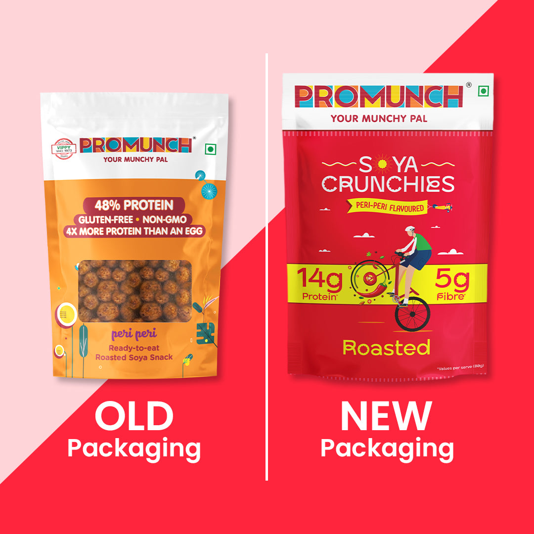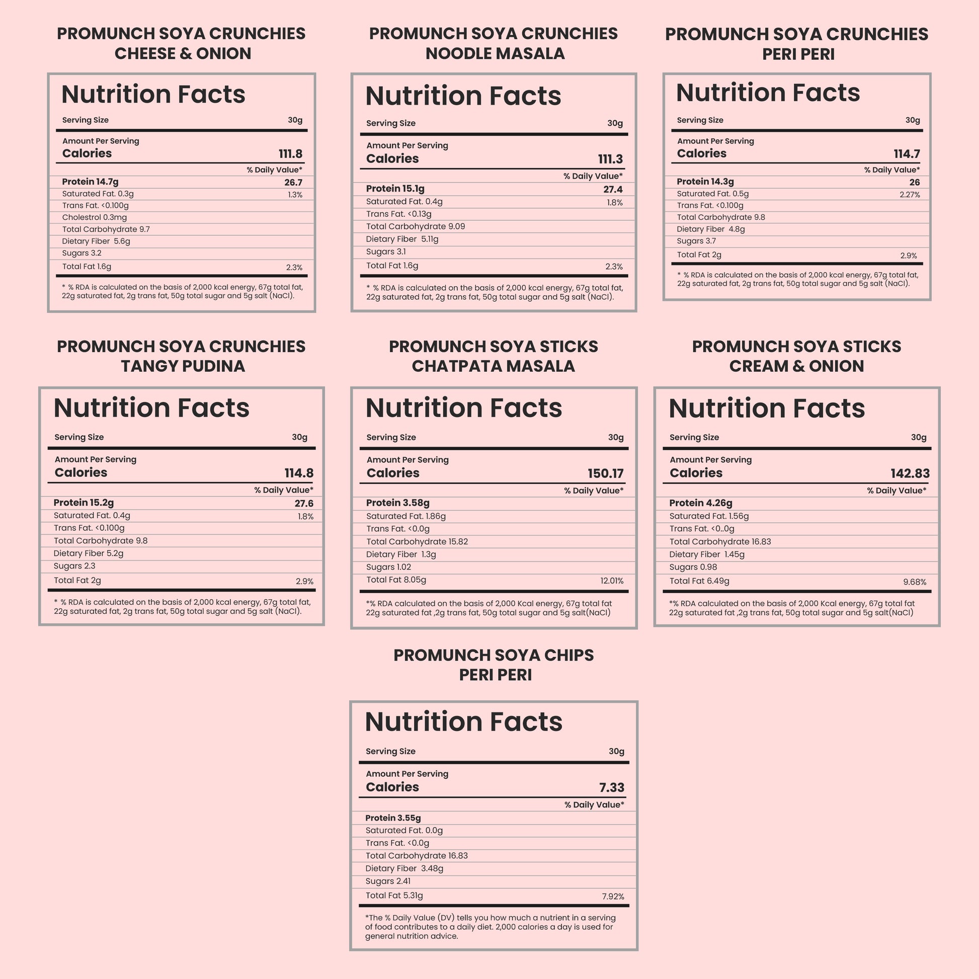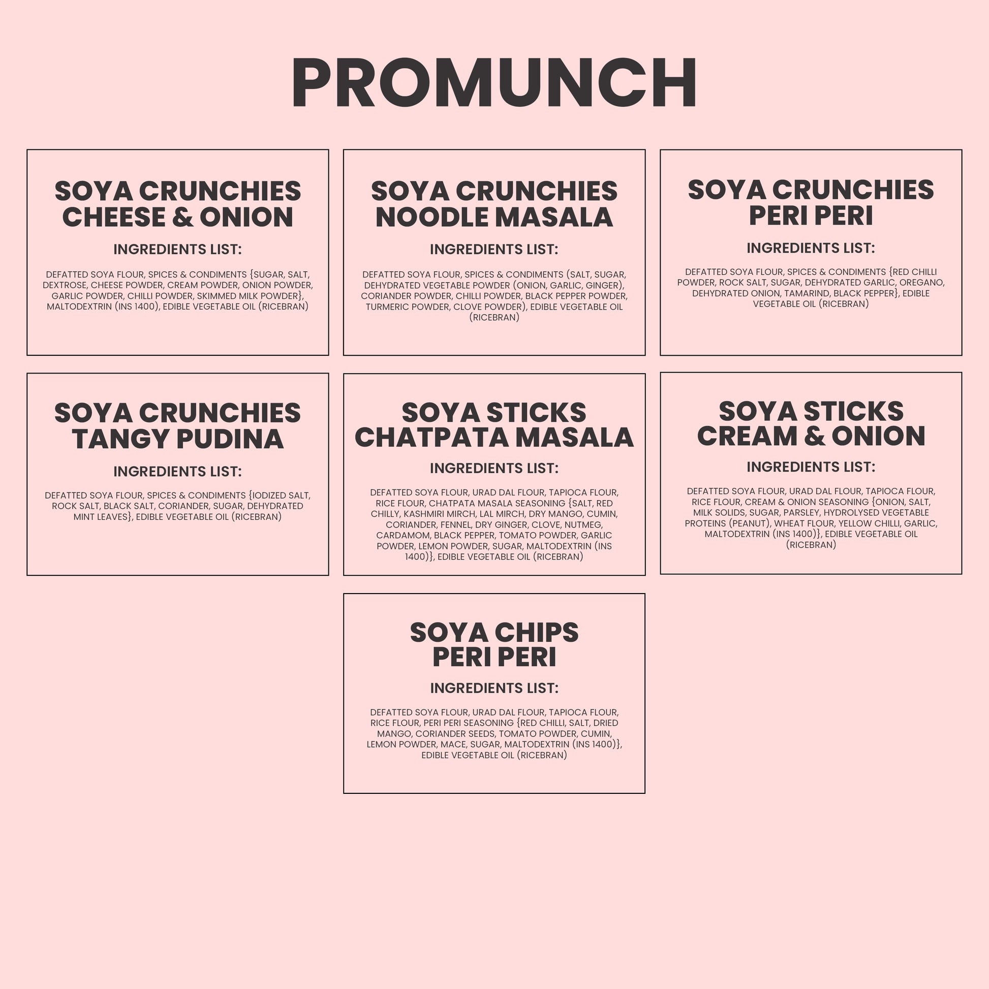 • Assorted Soya Crunchies Pack (30g x 4): Tangy Pudina, Cheese & Onion, Noodle Masala, and Peri Peri – each offering protein, gluten-free, vegan plant based protein.